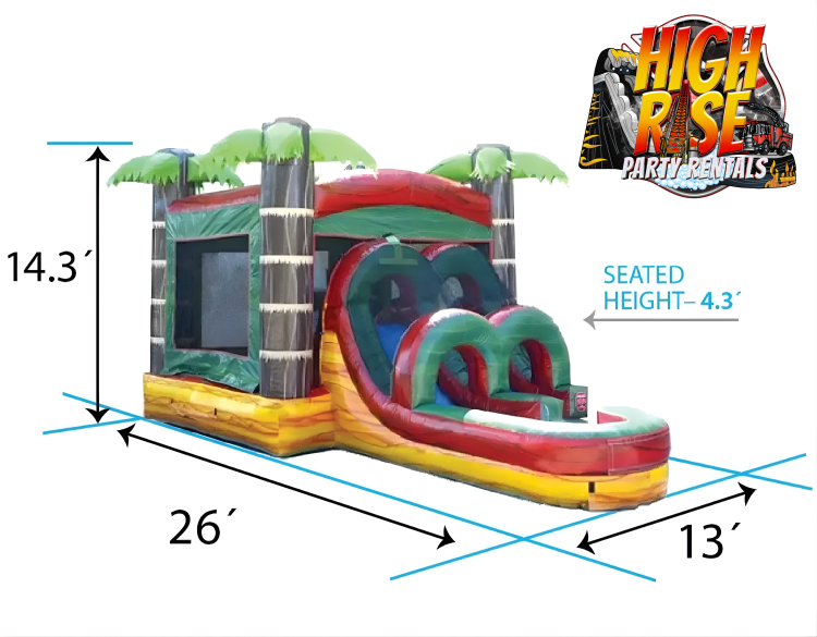 Turn up the excitement at your next event with the Tropical Fire Wet or Dry Combo, where bold island vibes meet nonstop action. With its palm tree details and fiery tropical colors, this inflatable brings the perfect splash of adventure to any backyard or celebration.